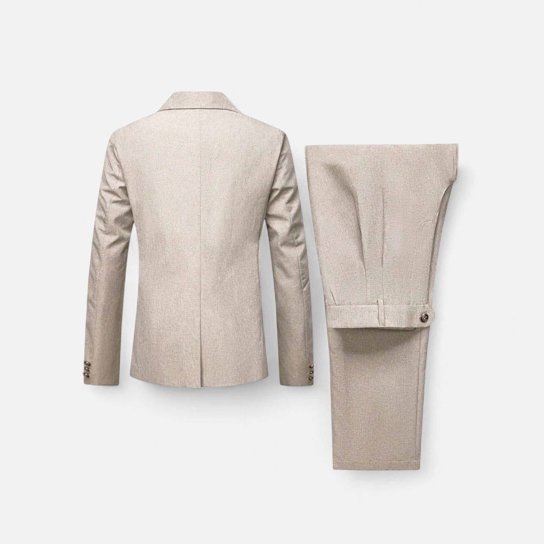 Dieses Herren Anzug-Set besteht aus einer Jacke mit klar geführter Knopfleiste und einer entsprechend gestalteten Hose mit geradem Beinverlauf. Die Jacke zeigt definierte Schulterpartien und einen sachlichen Aufbau ohne zusätzliche Elemente. Die Hose ist gleichmäßig geschnitten und ergänzt das Ensemble in ruhiger, gleichmäßiger Form. Die Silhouette des Sets ist durchgehend strukturiert.